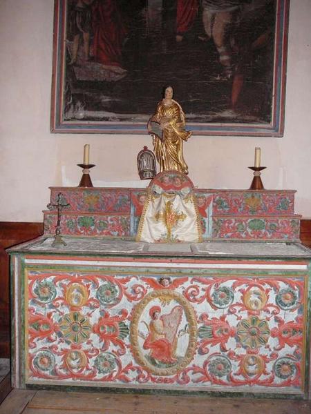 Médaillon de sainte Cécile jouant de la harpe au centre du devant d'autel. Ornementation de rinceaux fleuris et de coquilles, peinte en rouge vert et ocre sur fond blanc. Têtes d'anges dans des nuées sur les côtés et au fronton du tabernacle.