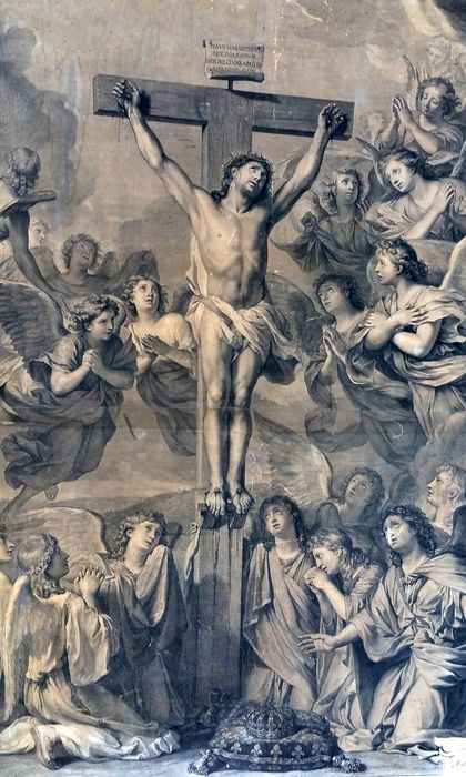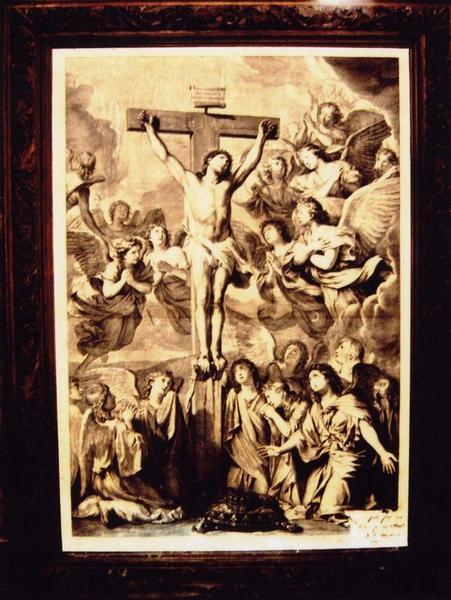 Gravure réalisée par Gérard Edelinck (Anvers 1649- Paris 1707), graveur du cabinet de Louis XIV et chevalier de l'ordre de Saint-Michel, d'après le tableau du Crucifix aux Anges de Charles Le Brun (conservé au musée du Louvre, inv. 2886). Cette estampe a été donnée par Jean Antoine Fourrat Aillaud, maire de la commune, en 1836.
