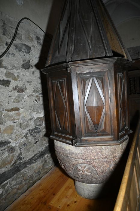 fonts baptismaux ; couvercle des fonts baptismaux ; réserve à eau baptismale ; vase pour l'administration du baptême