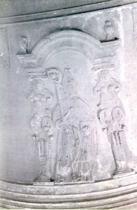 en frise : palmette, fleuron, quintefeuille ; Christ en croix ; Vierge ; évêque