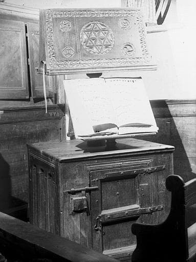 Armoire de plan carré, à un battant ; lutrin double face sur pied tourné fixé au centre du plateau de l'armoire, lutrin plus petit sur court pied tourné en avant du précédent ; ensemble en noyer à l'exception du petit lutrin (en pin). Armoire : sur la façade, coupes carrées pour le bâti et coupes mixtes pour le battant, moulures petit cadre ; sur les côtés, coupes carrées, pièces horizontales et verticales rapportées ; gros clous sur le battant et les côtés, grosses chevilles sur le bâti. Garnitures en fer forgé : trois pentures, serrure à bosse, poignée tombante sur petite platine découpée. Décor à relief en réserve, à la gouge et au couteau, sur la face du grand pupitre.