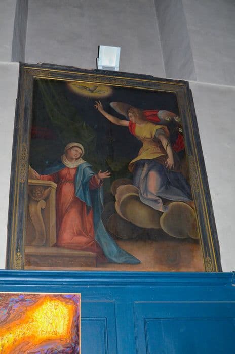 La Vierge, agenouillée, en prière, reçoit la Visite de l'Ange Gabriel qui pointe de son doigt la colombe du Saint-Esprit et tient à la main des lys.