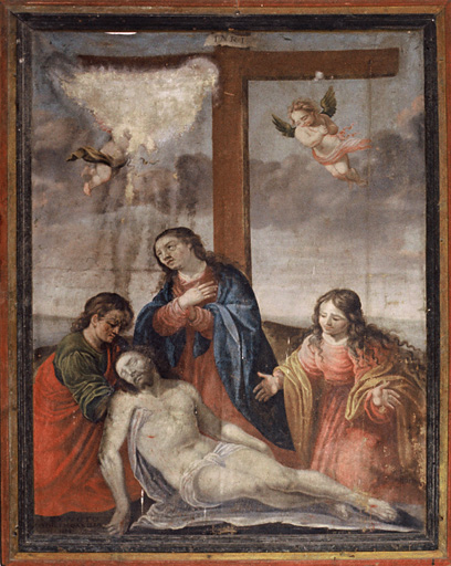 Le Christ est étendu au pied de la croix ; auprès de lui : saint Jean-Baptiste, la Vierge et sainte Marie-Madeleine ; dans le ciel : deux angelots voletant. Ce tableau est constitué de deux lés de toile avec couture verticale ; la couche préparatoire est de couleur crème et la couche picturale est mince.