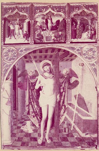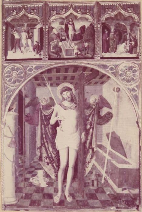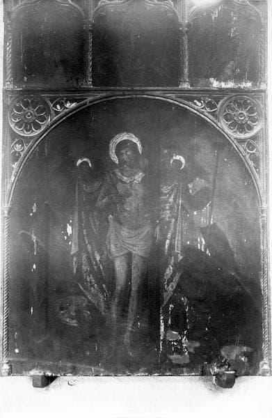 Autrefois panneau central d'un triptyque. Ecce Homo sur le panneau central ; trois petits panneaux placés au-dessus figurent la Flagellation, la Résurrection et le Couronnement d'épines.