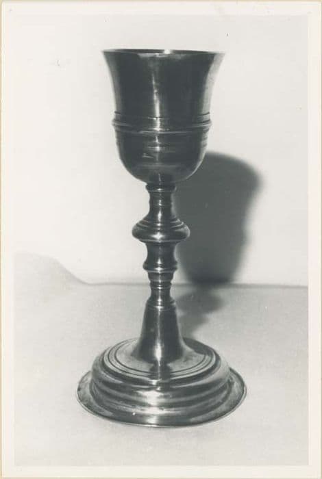 Pied circulaire composé d'une partie formant soubassement et d'une seconde partie, tronconique, supportant un noeud en balustre, évasé souligné de moulures. Coupe évasée, campaniforme, également décorée de moulures.