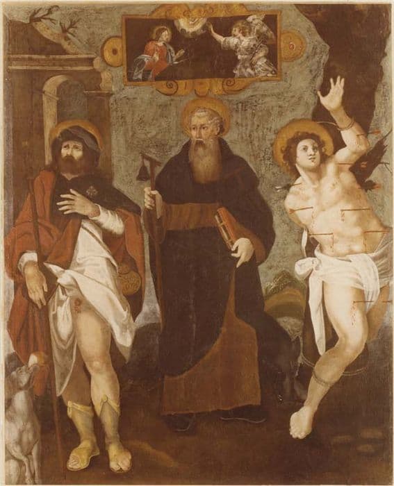 tableau : Saint Antoine l'ermite entre saint Sébastien et saint Roch, l'ange et la Vierge de l'Annonciation