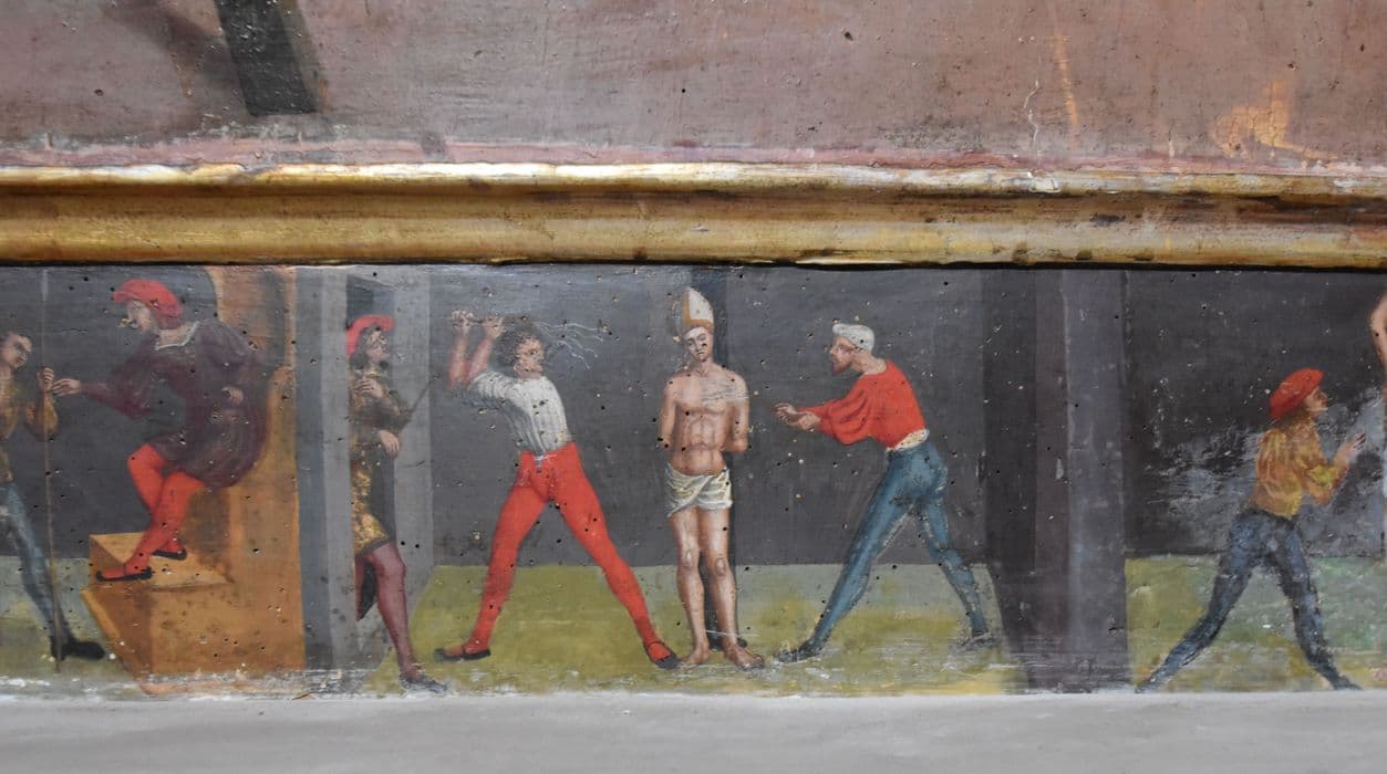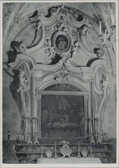 Retable de saint Erasme. Le classement droit comprendre : le retable de l'école de Bréa, d'un réalisme saisissant ; le mobilier : l'encadrement en stuc du 18e siècle, huit chandeliers en bois sculpté et doré du 18e siècle et les canons d'autel en bois doré du 17e siècle.