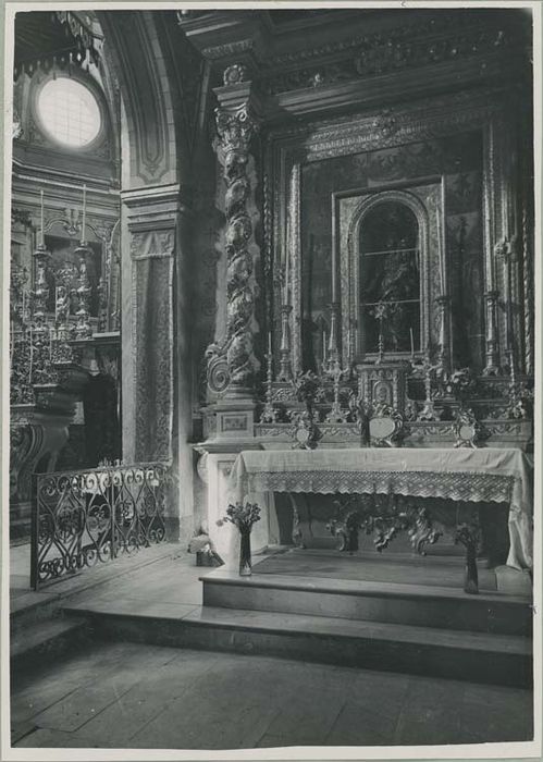 Autel du Rosaire et son retable, toile peinte. Le classement doit comprendre : le retable en bois sculpté polychrome et l'entablement en stuc, 18e siècle ; la table d'autel en stuc du 18e siècle ; les Mystères du Rosaire, toile du 18e siècle ; le mobilier : six chandelier en bois sculpté et doré du 18e siècle, un crucifix d'autel du 17e siècle et les canons d'autel.