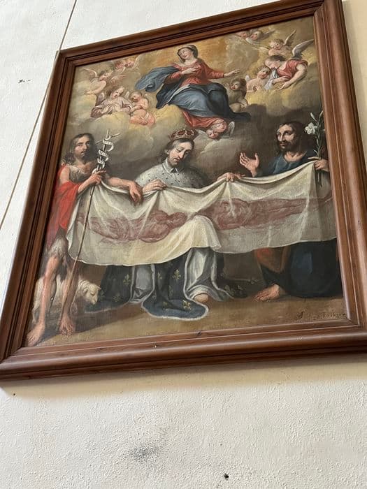 tableau : la Vierge en gloire et saint suaire du Christ présenté par le bienheureux Amédée de Savoie, entre sainte Brigitte et saint Joseph