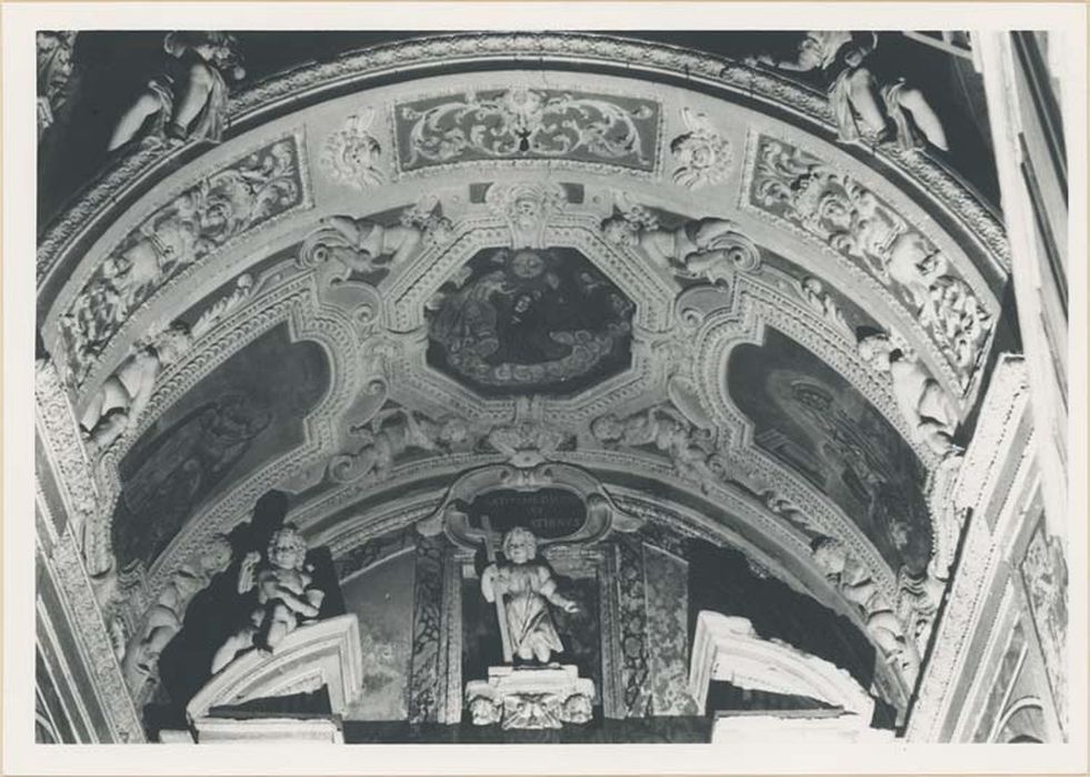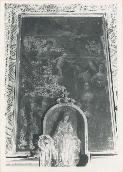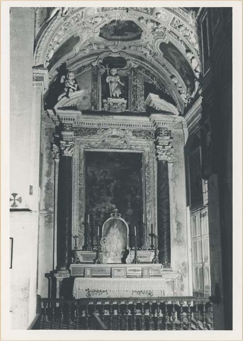 Autel et retable de la chapelle de la Vierge médiatrice, au fronton, statue de l'enfant Jésus portant sa croix, gypseries et bois, 17e siècle, sa toile, Vierge à l'enfant entourée de saints, 17e siècle, et décor de la chapelle, gypseries et cartouches peints, 17e siècle.