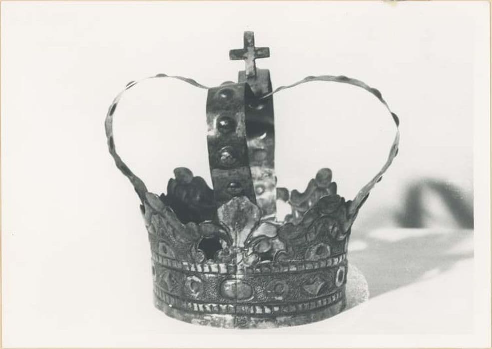 Couronne royale à quatre branches surmontées d'une croix. Ornementation de frises à motifs géométriques, médaillons et fleurs de lys, perles, etc... simulant des joyaux.