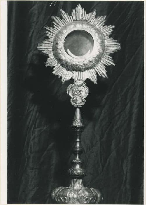Pied circulaire décoré en relief de six renflements arrondis décorés de feuilles d'acanthe (au repoussé et ciselé). Le noeud est décomposé en trois parties : campaniforme et en balustre, surmonté d'un médaillon de style rocaille. Le soleil aux rayons rassemblés en figures triangulaires de peu d'ampleur pourrait être antérieur (17e siècle).