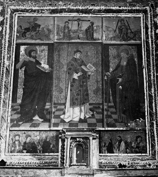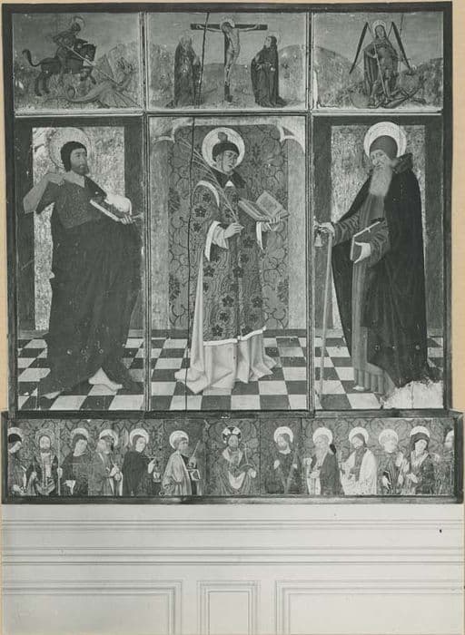 En chef, saint Georges, le Crucifiement et saint Michel. Au centre, saint Jean-Baptiste, saint Etienne et saint Antoine ermite. Prédelle, plusieurs saints et saintes.
