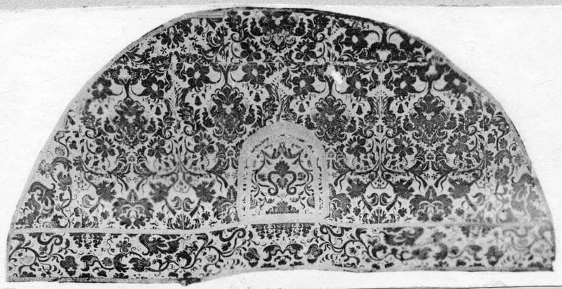 Velours de Gênes lamé d'or avec vases, paniers de fleurs, feuillages, fleurs en relief.