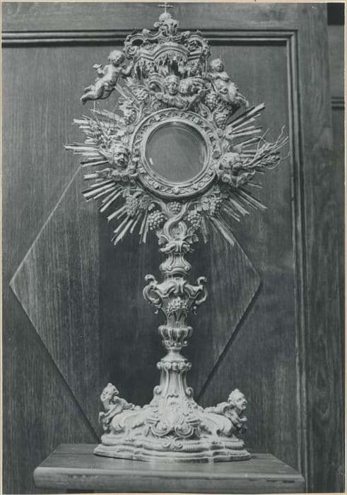 Ostensoir surmonté d'une couronne royale de style baroque. Pied chantourné à décor de médaillons, volutes, feuilles d'acanthes, avec deux têtes d'angelots en relief dorés. Noeud en balustre décoré de même. Lunule circulaire supportée par deux guirlandes décorées de pampre et épis de blé entourée d'un grand soleil dorés et sommée d'une couronne royale hissée par deux angelots.