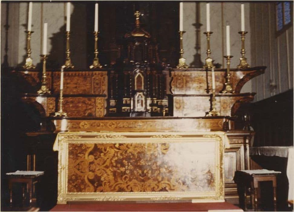 Marqueterie de bois (noyer, buis, citronnier, palissandre et acajou). Le maître-autel a été réalisé par un artisan local en réutilisant un tabernacle (changement de fonction) plus ancien (fin du 17e siècle). L'antependium et les trois degrès sont plaqués de bois marqueté, décoré dans le style du 17e siècle : rinceaux, ramages, bouquets et arabesques.