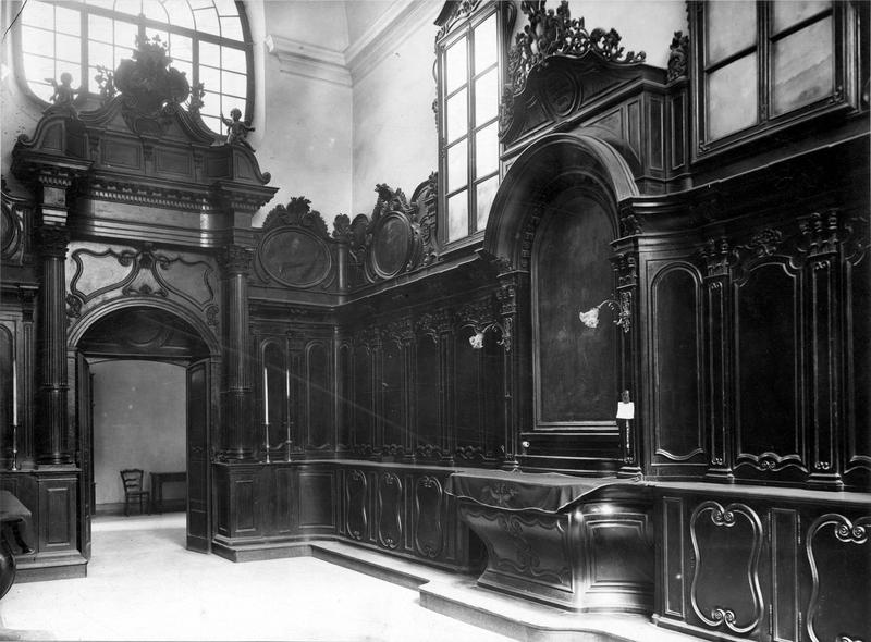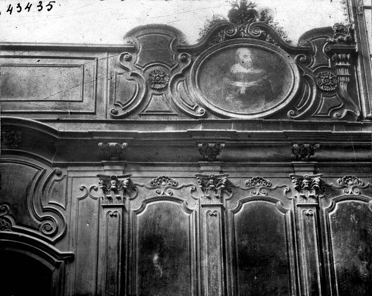 Boiseries de la sacristie. Dans les panneaux, quelques toiles : sujets religieux et portraits de prélats.