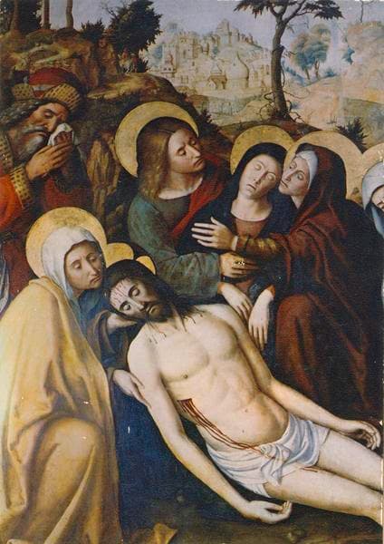Retable de la chapelle du collatéral Sud : la Descente de croix. Prédelles : cinq sujets.