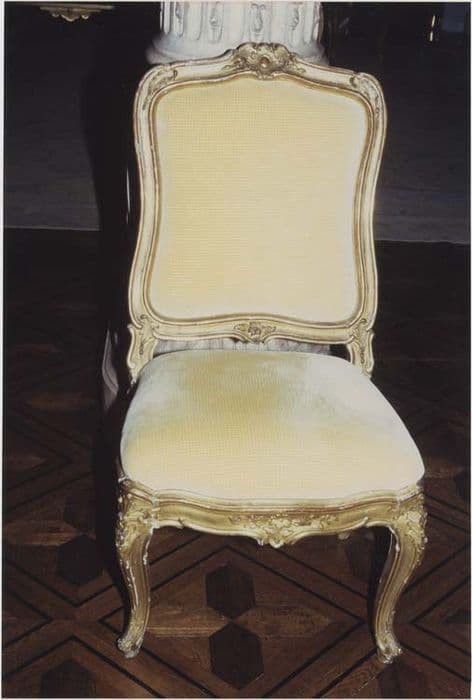 Six chaises en bois sculpté et doré. Les boiseries sont décorées de motifs de style rococo tardif. Les chaises ont été récemment recouvertes d'un velours jaune uni moderne.