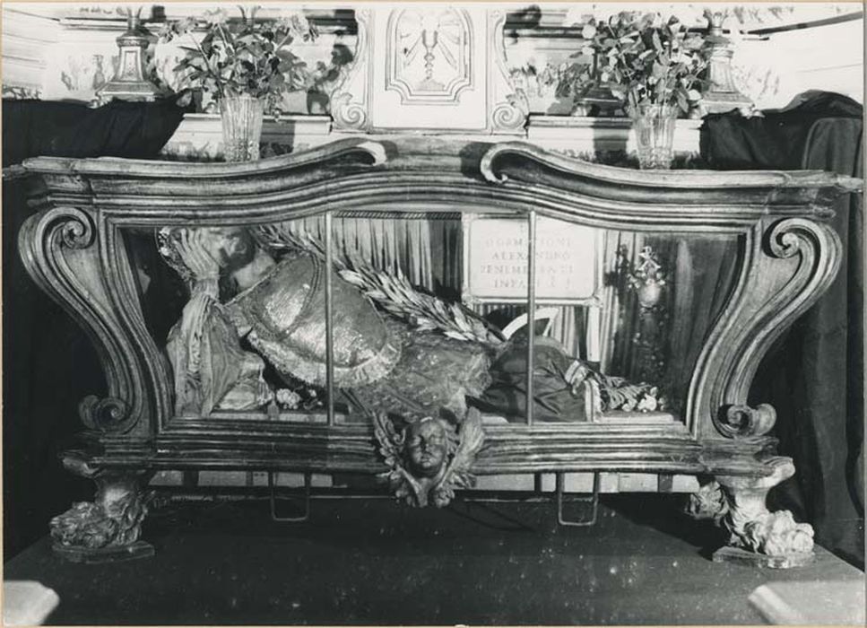 Châsse ou reliquaire. La châsse, dont les baies sont trapézoïdales repose sur des grosses pattes de lion, les contours de ses vastes baies sont constituées de volutes vigoureuses avec reliefs. Les ossements de saint Alexandre sont masqués par un corps factice aux proportions réduites : tête de cire, plastron en cotte de mailles, etc...