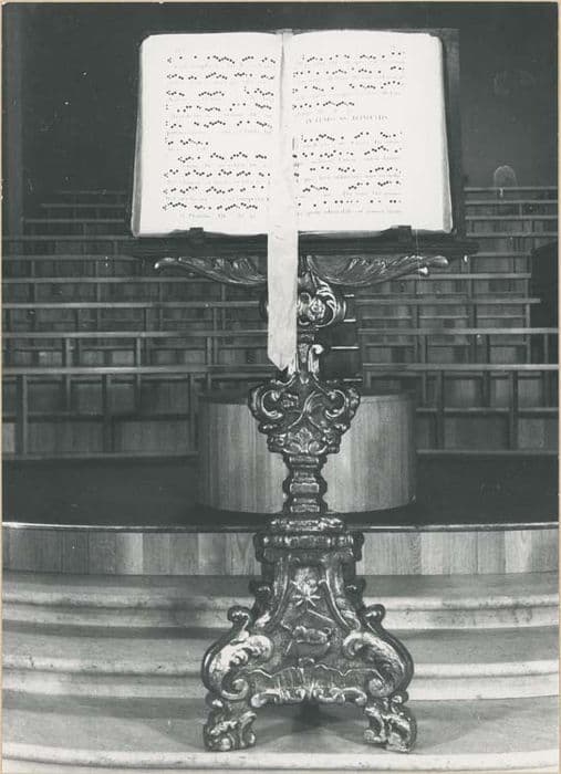 Lutrin ressemblant à un chandelier avec socle tripode décoré de volutes et de feuilles d'acanthe avec agneau pascal sur les faces. Noeud en forme de coeur décoré de même, ensuite pupitre décoré de feuilles d'acanthe.
