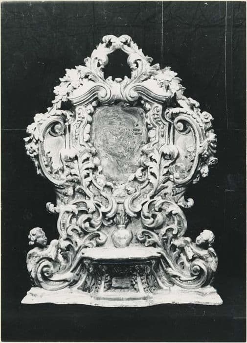 Bois sculpté et doré et miroirs. Derrirère le petit socle destiné à porter une croix ou bien le saint sacrement, miroir ovoïde richement contourné de volutes, coquilles ajourées, têtes d'angelots et guirlande de feuilles et de fleurs.