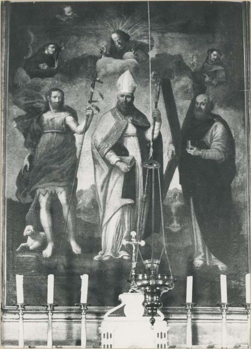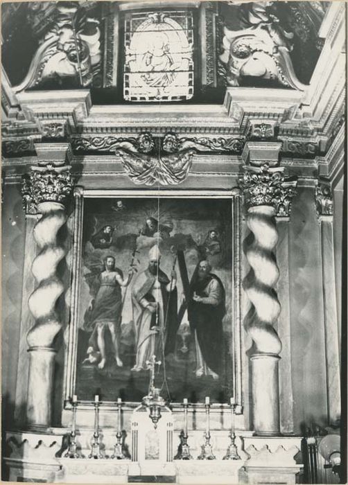 Balustrade à deux volées séparées par une grille fixée par deux paumelles. Balustres de section quadrangulaire, à simple poire. Grille décorée de volutes rehaussées de feuilles d'acanthe et de fleurs, au centre calice avec élévation du saint sacrement.