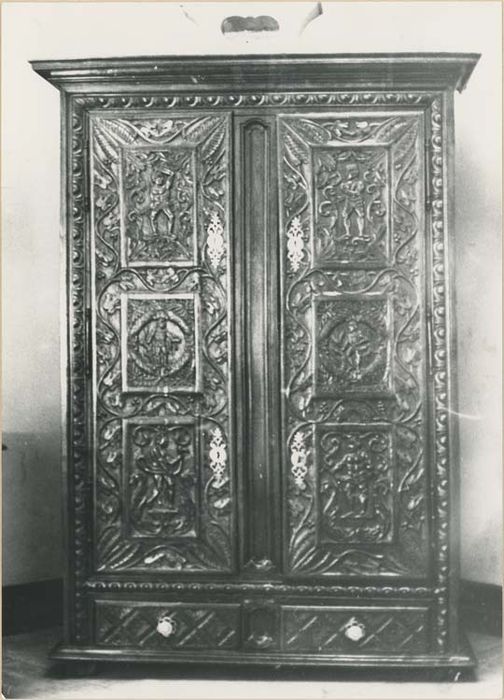 Armoire en noyer, ferrures en cuivre. Armoire à un seul corps, un seul grand placard sur deux tiroirs. Vantaux décorés d'une frise en spirale (rameaux) entourant des panneaux à personnages sculptés.