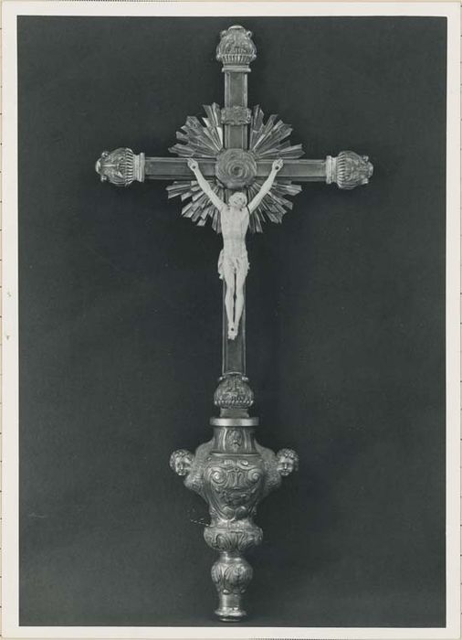 Pied constitué par deux volutes encadrant une coquillette. Bras de la croix décorés par un fond en écailles de poissons et terminés par un grand motif en forme de coeur. Rayonnement à la croisée.