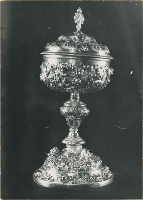 Ciboire à pied circulaire avec rinceaux et effigies en haut relief des personnages de la sainte Famille. Noeud évasé et coupe à bords verticaux avec décor identique. Couvercle à deux calottes avec croix au sommet.