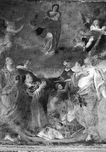 tableau, cadre : la Vierge en gloire entourée de sainte Catherine d'Alexandrie, saint Dominique, saint Thomas d'Aquin et sainte Marie-Madeleine, avec un portrait du donateur