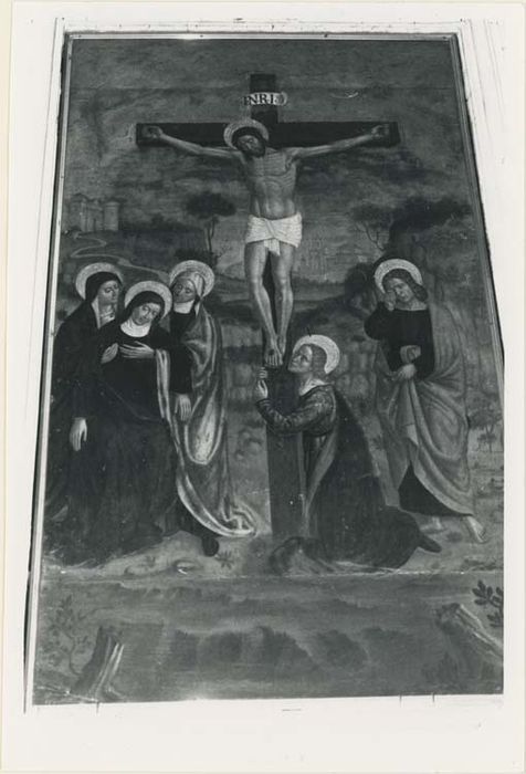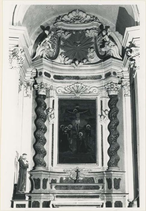 Autel retable exécutés vers 1730-1750. Toile du 16e siècle, qui s'inspire très nettement de la Crucifixion de Louis Bréa datée de 1512, du monastère de Cimiez à Nice, la figure du saint Jean pleurant ayant été ajoutée à droite.