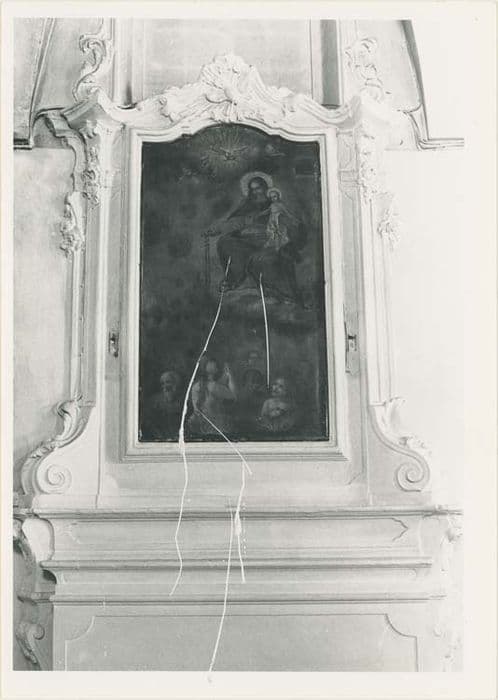 Toile et retable, encadrement mouluré rehaussé de gypseries de style rocaille, en partie doré. Retable supporté par un socle simulant un autel latéral. Encadrement : feuilles d'acanthes, fleurs en guirlandes, etc...