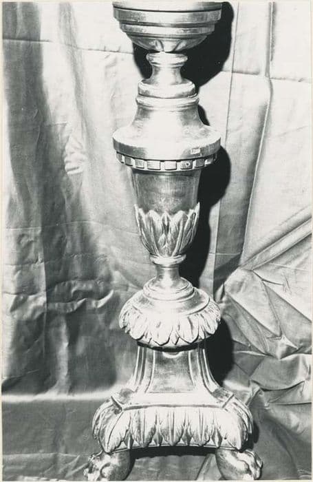 Chandeliers tripodes, décorés sur une seule face, tronqués (privés de leur fût) par une restauration. Socle pyramidal décoré de feuilles en frise, noeud évasé décoré de feuilles et denticules supportant la bobèche.