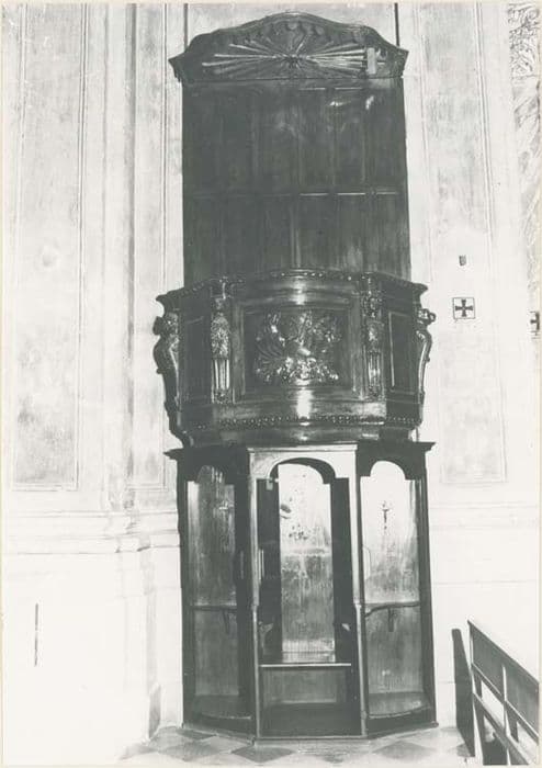 Cuve de section polygonale, le côté médian animé d'une ligne courbe. Des angelots cariatides séparent les panneaux les uns des autres, celui du centre est décoré en relief de motifs symboliques se rapportant à la Prédication. Deux frises (feuilles et oves) ornent le haut et le bas de cette cuve. Abat-voix à lambrequin, portant en son ciel la colombe du saint Esprit rayonnante.