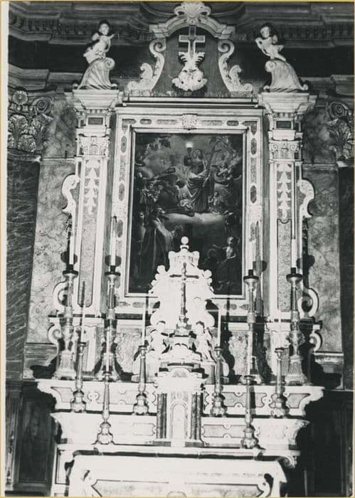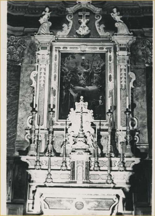 Autel à tombeau surmonté de gradins, avec tabernacle à colonnes et exposition, marbres en partie sculptés. Table d'autel à tombeau décorée d'un médaillon entouré de deux palmes, deux gradins entourant le tabernacle à colonnes. Le tout est décoré de panneaux de marbre inscrusté de rouge avec liseré noir, sur fond blanc. Aux extrémités, têtes d'anges et médaillons sont l'un porte une date. L'exposition consiste en un dais à lambrequin soutenu par des anges.