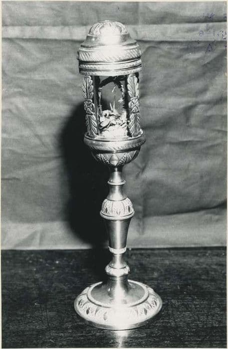 Pied circulaire et noeud en balustre décorés de larges feuilles pointues, stylisées. L'ampoule contenant la relique figure sous un petit dôme décoré de frises à motifs géométriques et de feuillages stylisés.