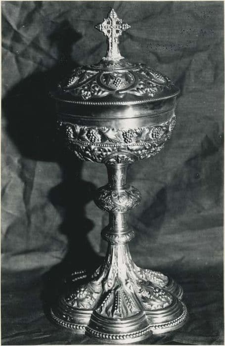 Ciboire à pied circulaire polylobé, sur chaque lobe motifs végétaux se référant à l'Eucharistie (pis de blé, grappe de raisin). Noeud sphérique aplati. Coupe et couvercle décorés des mêmes motifs végétaux avec dominante de grappes de raisins.