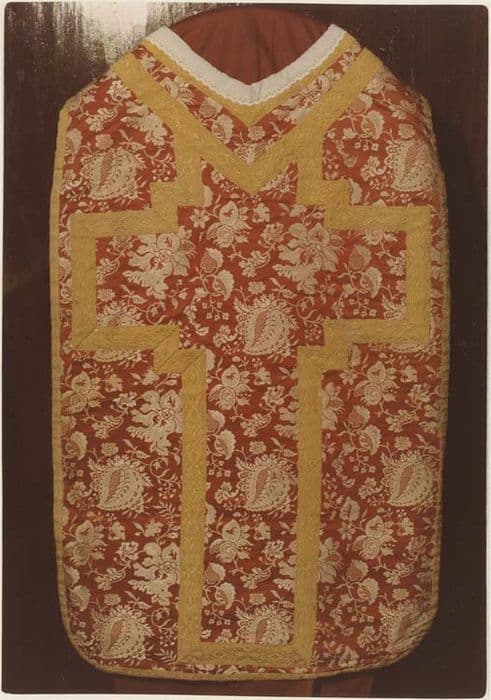 Soie lampassée motifs blancs sur fond rouge orangé. Motifs végétaux (ramages et fleurs) blancs sur fond orangé. Au dos de la chasuble, croix composée par le galon jaune.