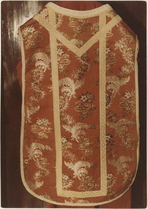 Ramages polychromes brodés sur fond de soie lie de vin. Ramages blancs et bouquets polychromes.