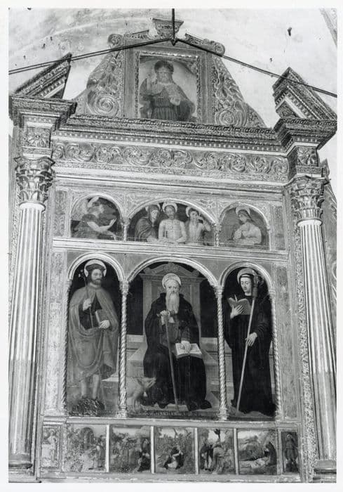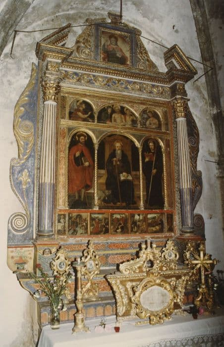 En chef, le Père Eternel. Au-dessous, trois petits panneaux, celui du milieu plus large que les deux autres, avec de gauche à droite : l'ange de l'Annonciation à mi-corps ; le Christ à mi-corps, après la descente de croix, soutenu par la Vierge et par saint Jean pleurant ; sainte Madeleine (compartiment en mauvais état). Grand panneau du centre : saint Joseph, saint Antoine abbé et saint Maur. Prédelle : scènes de la vie de saint Antoine.