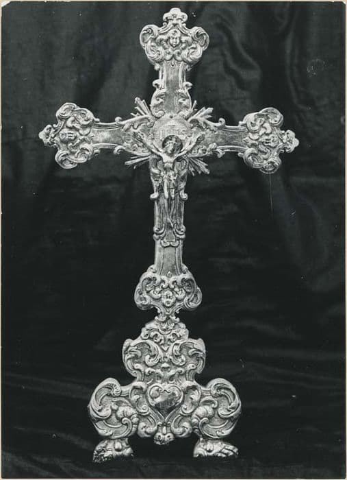 Le socle de profil triangulaire repose sur deux pattes griffues et est décoré de volutes, acanthes et coquilles ajourées. La croix se compose de quatre bras évasés vers le centre (croisée), et leurs extrémités décorées comme le socle avec aussi des têtes d'angelots. Le Christ a un corps aux membres grêles et allongés, avec la tête auréolée.