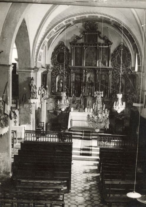 Retable du maître-autel, panneaux peints. Niche vide au milieu. Composé de sept panneaux. En chef : Père Eternel. Au-dessous : saint Pierre, l'Ascension, un saint évêque (saint Blaise ?). Au centre : sainte Elisabeth, sainte Anne et la Vierge, des deux côtés de la niche. Prédelle : le Christ avec les douze apôtres (cachée par l'autel).