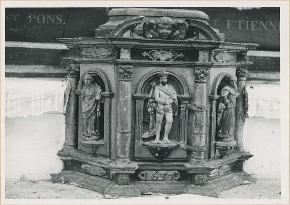 Tabernacle à trois faces. Face centrale : colonnes à chapiteaux corinthiens (très simplifiés) avec fronton brisé en arc de cercle avec tête d'angelot. Devant la porte, statuette du Christ de Pitié. Faces latérales : colonnes avec chapiteaux semblables (les premières communes avec la face centrale) niches avec statuettes de saint Pierre et saint Paul.