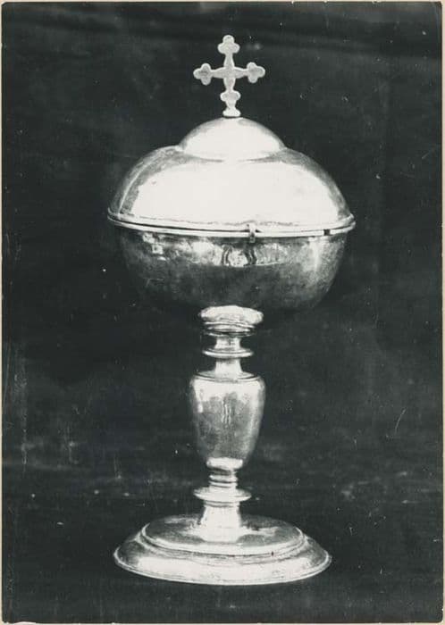 Pied circulaire, noeud ovoïde, coupe et couvercle sphériques avec ressaut et calotte sommitale surhaussée. Croix à extrémités tréflées.