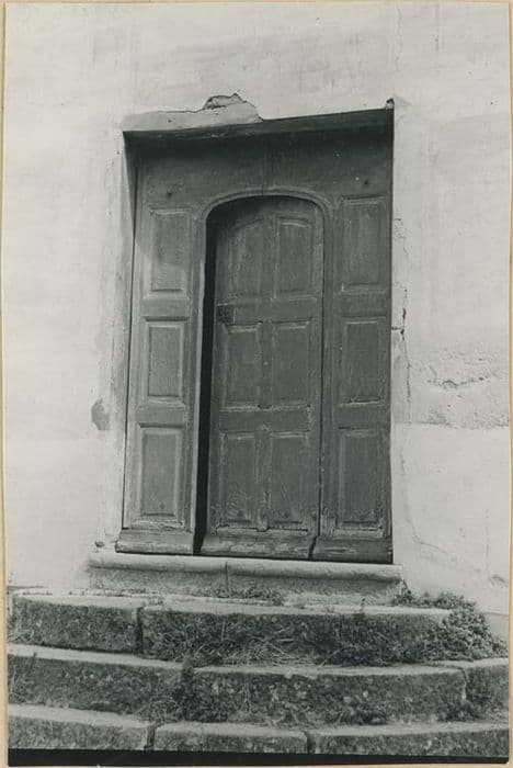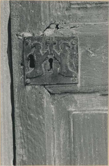 Porte. Porte à deux vantaux latéraux, avec portillon central. La plaque de protection de la serrure, en fer forgé avec deux pénitents à genoux, au pied de la croix, est particulièrement intéressante.
