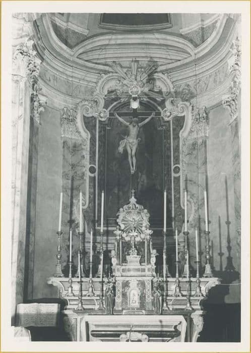 Gypseries polychromes. Retable de style rocaille, avec deux pilastres à chapiteaux corinthiens de part et d'autre. Le retable constitue l'encadrement de la toile cintrée et se compose de volutes rehaussées de coquilles déchiquetées avec fronton chantourné encadrant une gloise d'angelots avec rayonnement.