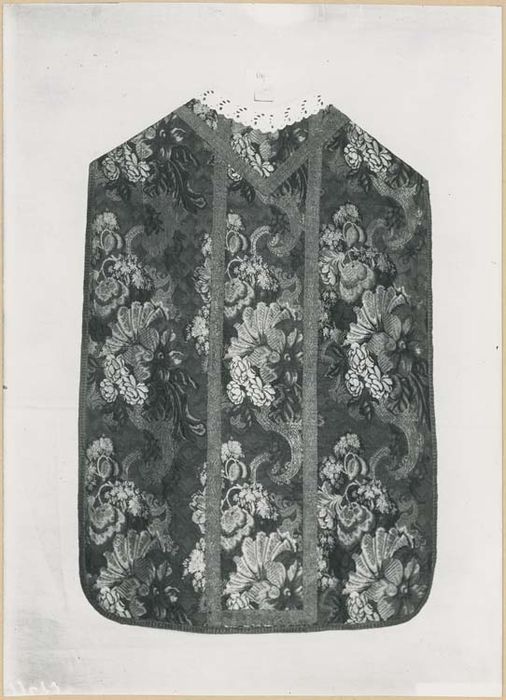 Soie, fond vert, tissée de fleurs de soie rouges, bleues et vertes.