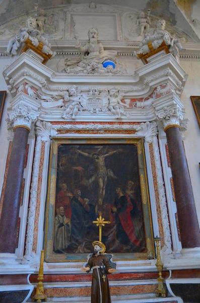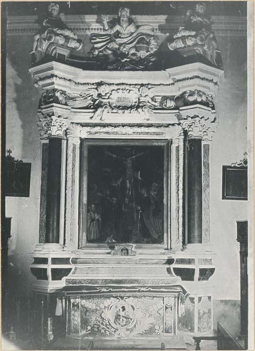 Autel et retable, avec sa toile. Table d'autel : décor végétal, palme et rameau d'olivier entourant les armoiries.