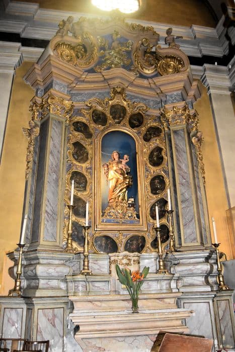 autel retable du Rosaire, 15 tableaux : les Mystères du Rosaire, statue : Vierge à l'Enfant